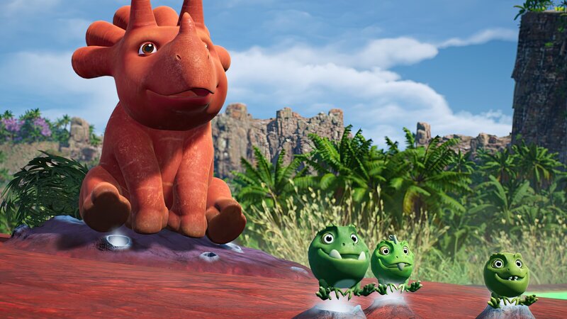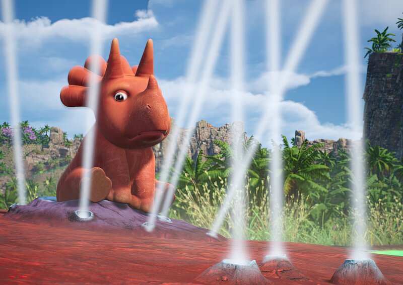 Die drei Erbs-Rex-Babys verwenden Dampflöcher eines Vulkans als lustiges Warmluftbad. Sie setzten sich darauf und die Heißluft wirft sie ein Stück in die Luft. Ginger ist leider zu schwer, um es ihnen gleichzutun. Daher muss sie eine kreative, andere Methode für Luftsprünge finden.