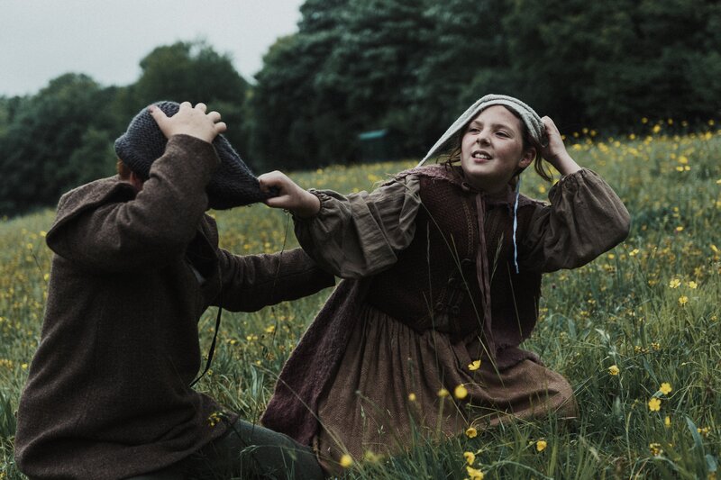 Gertrude, ein junges Mädchen, zupft an der Wollmütze von Mats, ihrem jungen Begleiter.