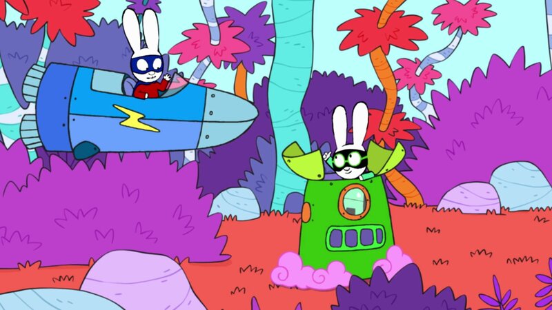 Super-Ferdi (l.) und Superhase (2.v.l.) versuchen beide im Alleingang, den bösen Professor Wolf (r.) und seinen Teddy-Roboter Mega-Mini (2.v.r.) mit Hilfe ihrer Raumschiffe zu fangen. Doch dabei stehen sie sich gegenseitig im Weg.