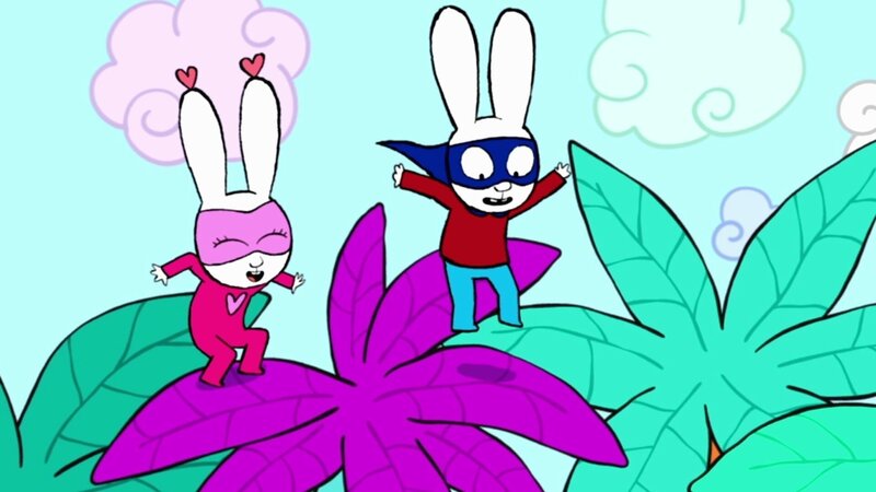 • Die großen Pflanzen in der Fantasiewelt, benutzen Super-Lou und Superhase für ihren Superhelden-Hindernisparcours.
