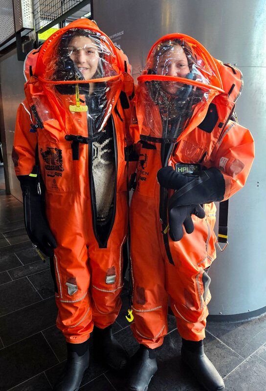• Gut verpackt: Im Ölmuseum von Stavanger dürfen Emilia (links) und Leyla (rechts) in die Sicherheitsanzüge der Bohrinsel-Arbeiter schlüpfen.