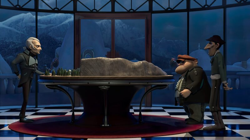 • Graylock (links) schmiedet in seinem Büro große Pläne für die Menschenstadt Umghard. Da staunen auch seine Handlanger Humbert (2. von rechts) und Spinoza (rechts) nicht schlecht.