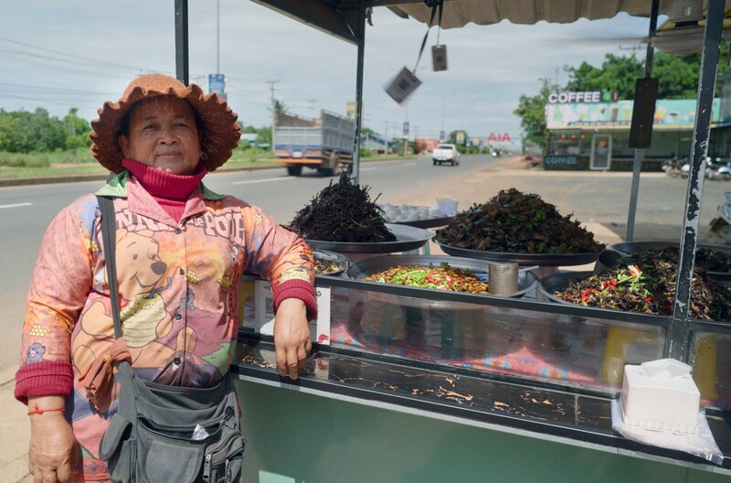 An einem Straßenrand in der kambodschanischen Kleinstadt Skun liegt ein Markt, der zum Pilgerort für Liebhaber essbarer Insekten geworden ist. Verkäuferin Meng Ran bereitet an ihrem Stand alles frisch zu.