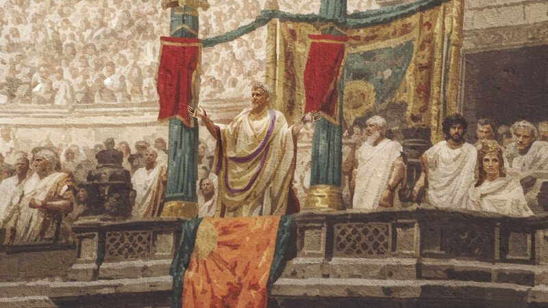 A 3D CGI shows an emperor in imperial box of the colosseum.