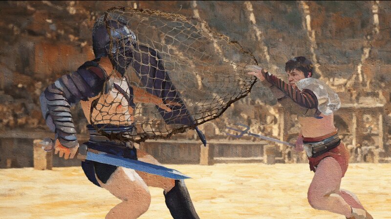 • A 2D CGI shows Retiarius gladiator fighting a Secutor gladiator in the arena.