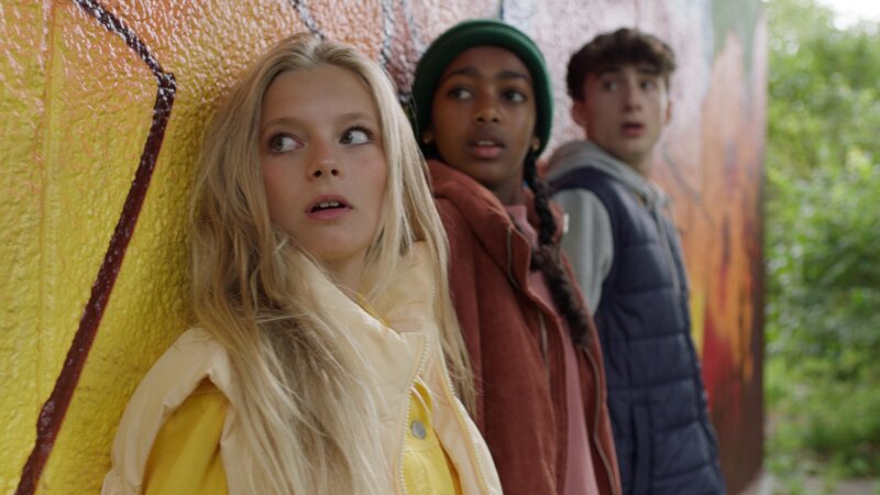 • Jenny, Naomi und Yasin verstecken sich vor Psycho-Roger (v.l.n.r.: Anine Bonnevie Nagell-Høyer, Solvana Tesfaye Tikabo, Yousef Ali Ismail).