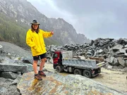 Christina soll einen Bagger von der Wazalpe abholen und ins Tal bringen. Dann geht es weiter zur italienischen Grenze, wo sie zwölf Tonnen Zyklopensteine abliefern soll. Doch es regnet in Strömen und die Straße ist schlammig und glatt.
