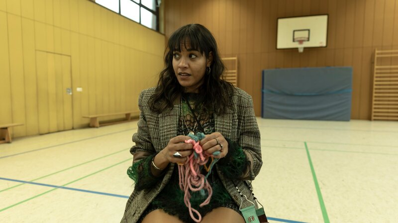Jo (Salka Weber) ist bei der Gruppentherapie und beschreibt ihre Probleme mit Hilfe eines Wollknäuels.