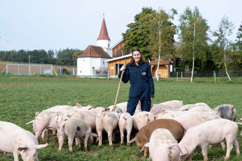 Katharina Mühlbauer wusste schon früh, dass sie den Hof ihrer Eltern im niederbayerischen Postau einmal übernehmen wird. 2015 begann die Familie mit der Umstellung auf Bio und eigenem Sojaanbau. Inzwischen leben die Schweine des Hofes sogar auf der Weide. Damit die Vermarktung ihrer Fleischprodukte sich rechnet, hat Kathi eine Hofmetzgerei mitsamt Online-Hofladen aufgebaut."