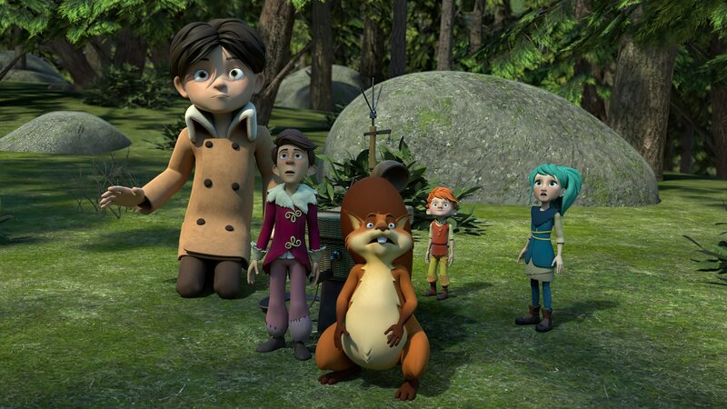 Erstaunt beobachten Klincus (links), Tipsar (2. von links), Eichhörnchen Ryllo (Mitte), Yuki (2. von rechts) und Glyn (rechts) das seltsame Flugobjekt, dass über ihren Köpfen hinwegsaust.