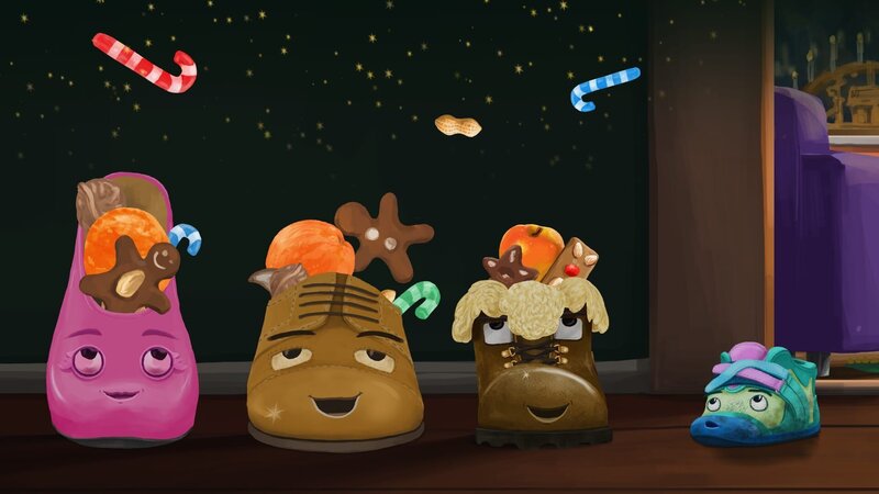 Am Nikolausabend treffen sich die unterschiedlichsten Schuhe im Flur. Turnschuh Wetz (rechts) ist das erste Mal dabei.