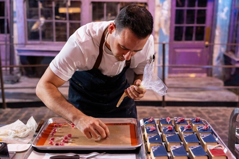 Als Hommage an die berühmte Winkelgasse bitten die Moderatoren James und Oliver Phelps jedes Team, fünfzig identische Mini-Desserts zu kreieren und sie am original Set an eine Menge eifriger Harry-Potter-Fans zu verteilen.