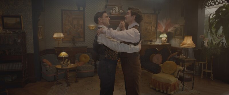 Alistair (Rik Young, r.) übt mit Clive (Jethro Skinner, l.) das Tanzen, denn Clive möchte Elena gern ausführen.
