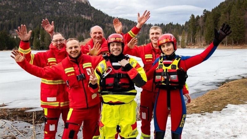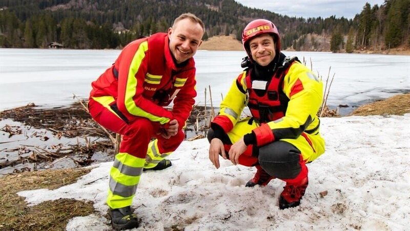 • Tobi (rechts) checkt gemeinsam mit Flo von der DLRG, warum es gefählich ist, ins Eis einzubrechen. Weiteres Bildmaterial finden Sie unter www.br-foto.de.