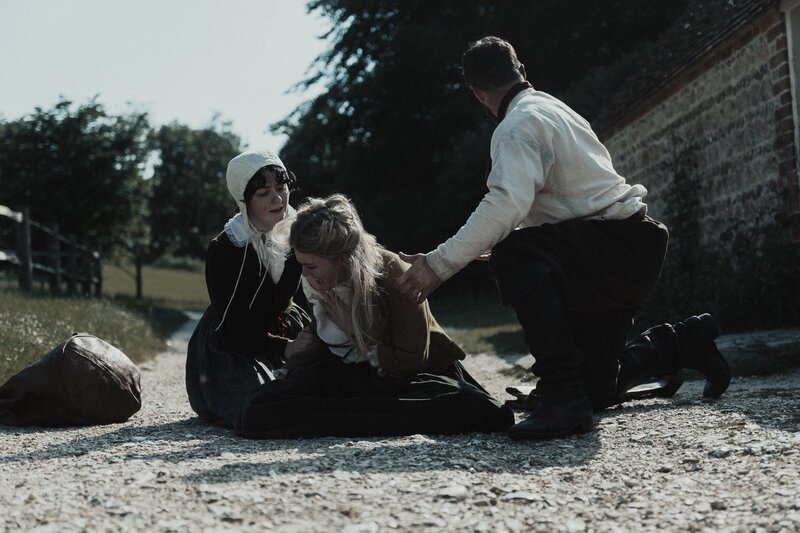 Mary Dunbar spricht mit zwei Richtern des Hexenprozesses.