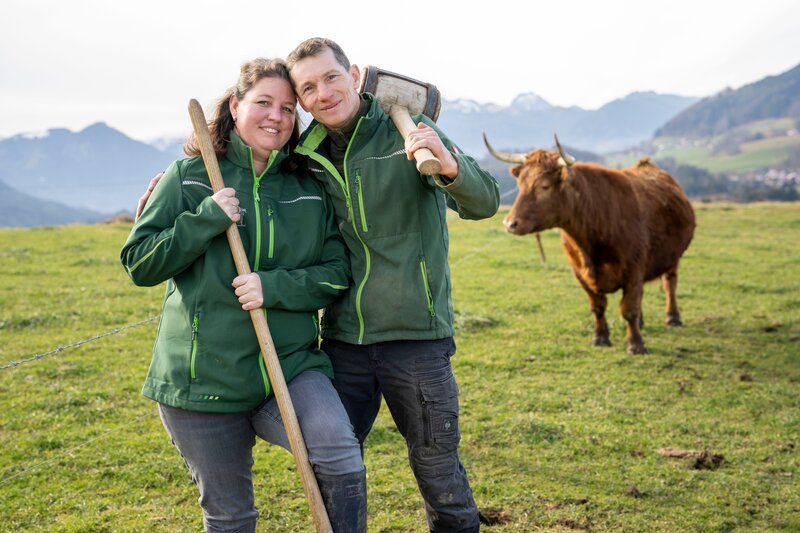 • Theresa Tischner mit ihrem Mann Hansi auf dem Hof "Beim Auer" in Samerberg.