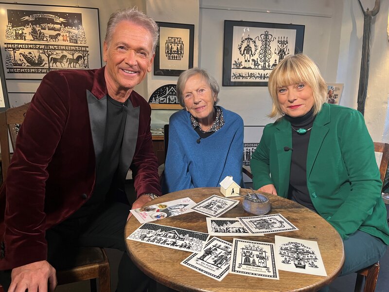 Olaf Berger bei der hundertjährigen Gudrun Beier, die diese wundervollen Scherenschnitte gefertigt hat, und ihre Enkelin Lydia Schönberg bei Dreharbeiten für die Sendung in Schwarzenberg.