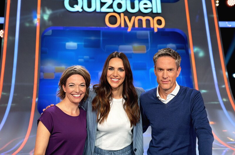 Moderatorin Esther Sedlaczek (M.) mit den Kandidaten des Teams "MOMA": Anna Planken (l.) und Sven Lorig (r.).