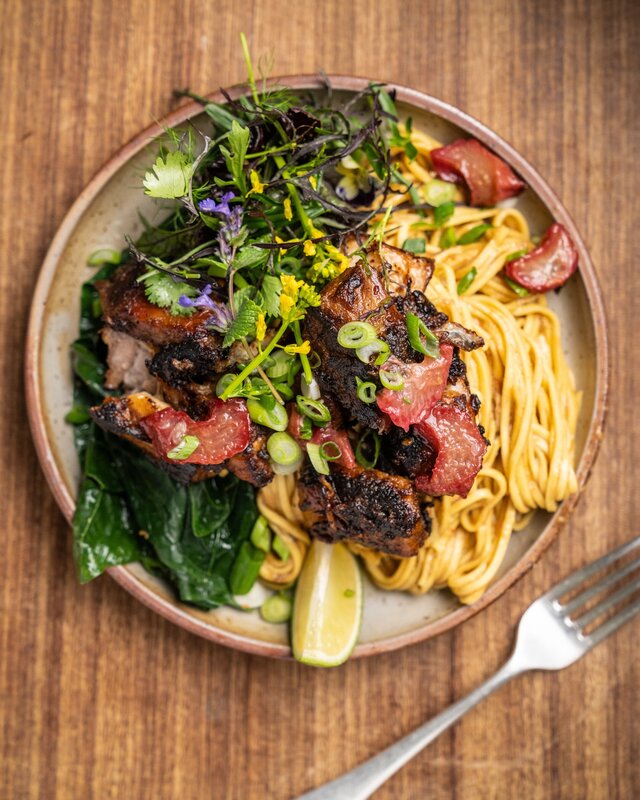 Bauchfleisch mit Rhabarbersauce und Nudeln.