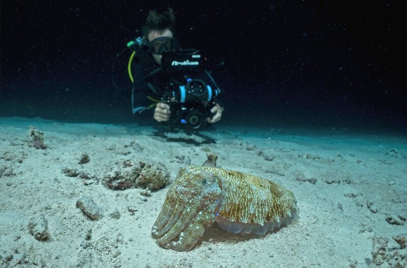 Biologe und Tierfilmer Manuel Spescha filmt einen Tintenfisch bei der Jagd nach kleinen Fischen.