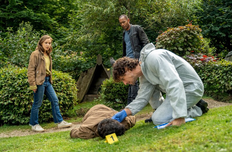 • Bei ihrem neuesten Fall führt es die Kommissare Sophia Strasser (Katharina Goebel, h.l.) und Jerry Paulsen (Peter Marton, h.r.) auf eine Falknerei. Der Tierarzt ist tot. Dr. Phillipp Hartmann (Jakob Graf, v.r.) untersucht die Leiche.