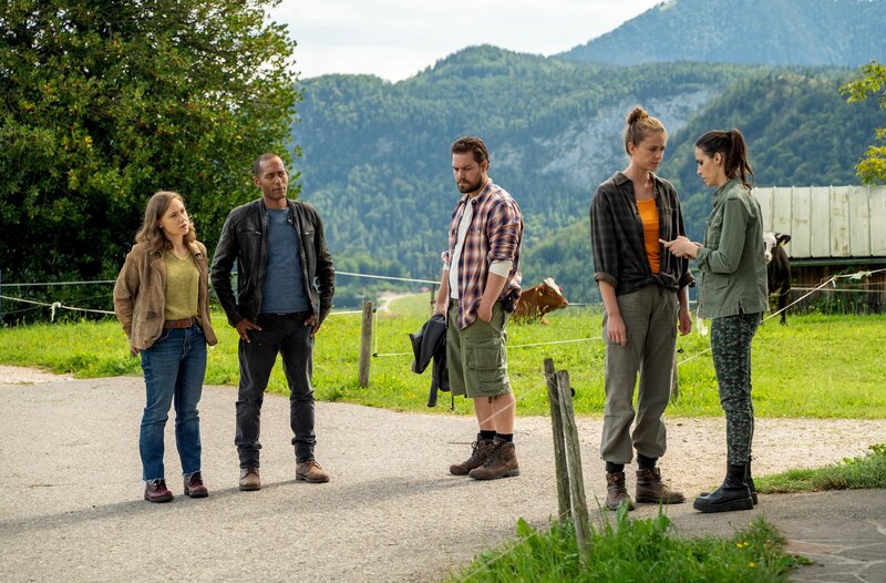 • Auf dem Weg ins Haus des Verstorbenen treffen die Kommissare Jerry Paulsen (Peter Marton, 2.v.l.) und Sophia Strasser (Katharina Goebel, l.) zusammen mit dem Paar Jakob (Julian Bayer, M.) und Klara Leitner (Alena von Aufschaiter, 2.v.r.) auf die Praktikantin des Tierarztes Delilah (Laila Khaddour, r.), die gerade erst von dem Tod ihres Chefs erfahren hat.