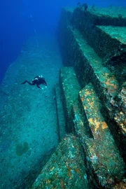 Ein Taucher untersucht die Sandsteinstruktur des unterseeischen Yonaguni-Denkmals. MYSTERIOUS ISLANDS nimmt die Zuschauer mit auf ein unvergessliches Abenteuer zur Erkundung der außergewöhnlichsten und rätselhaftesten Inseln unseres Planeten.