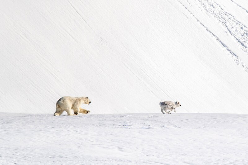 • Ein Eisbär versucht, ein Spitzbergen-Rentier zu jagen, weil das Meereis immer später zufriert und die Bären sich neue Nahrungsquellen erschließen müssen.