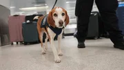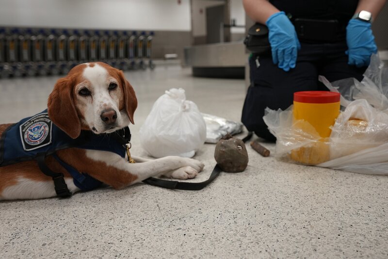 K-9 Snoopee legt sich neben mehrere religiöse Santeria-Artikel, die im Gepäck eines Passagiers gefunden wurden. in Miami, Florida (National Geographic)