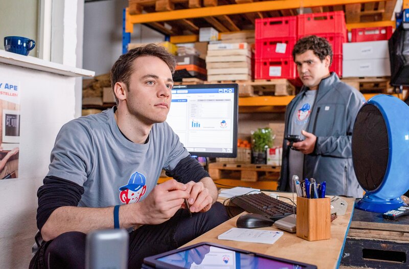 • Lenny (Fabian Hanis, l.) sitzt am Empfang von Delivery Ape und spielt gedankenverloren mit dem Stift. Adrian (Danilo Kamperidis, r.) scheint er nicht wahr zu nehmen.