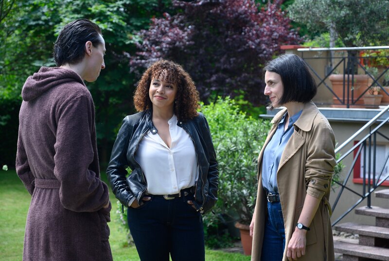 • Deutsch-französische Ermittlungen: Commissaire Noémie Legrand (Sandy Lewis, mi.) und Hauptkommissarin Esther Baumann (Brigitte Urhausen, re.) befragen Merlin Bravard (Daniel Séjourné, li.) in Petite Rosselle (Frankreich).
