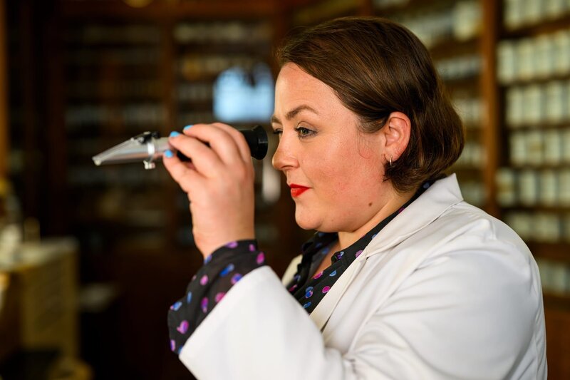 Voller wissenschaftlicher Neugier späht Melanie Harms (Tina Pfurr) durch ein mikroskopartiges Instrument. Wird die Analyse der Wasserzusammensetzung im Forschungsbecken das fehlende Puzzleteil im rätselhaften Mordfall liefern?