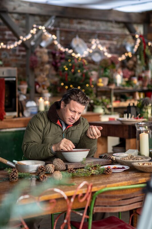 Jamie zaubert für seine Gäste ein exquisistes winterliches Menü, das aus Käse-Walnuss-Gebäck, einer aus Blumenkohl und Romanesco zubereiteten Gemüselasagne, schmackhaften Hühnerspießen und einem Toffee-Kaffepudding besteht.