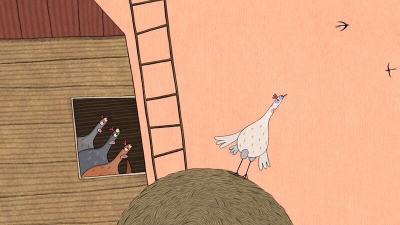 Eigentlich soll das weiße Huhn auch Eier legen, so wie die anderen Hühner es vormachen. Doch die Schwalben am Himmel haben eine ganz andere Sehnsucht in ihm geweckt: Es will fliegen! Das Huhn hat einen unwiderstehlichen Drang die Sache mit dem Fliegen auszuprobieren. Es steigt auf das Dach des Hühnerstalls und springt ab. Das Folgende kann man nicht unbedingt Fliegen nennen, aber das Huhn ist glücklich und plötzlich klappt auch etwas anderes...
