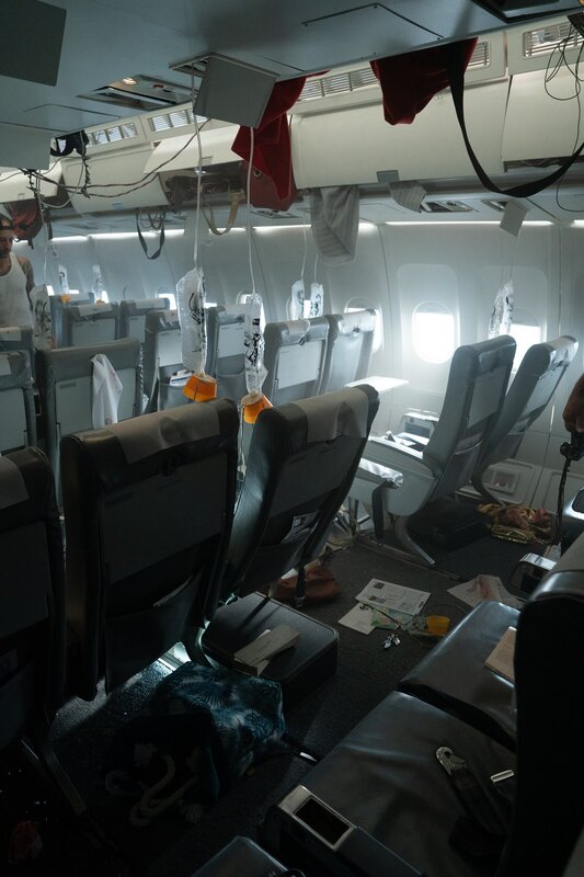 Auf der Suche nach der Ursache für die schweren Erschütterungen an Bord des China Eastern Airlines Fluges 583 inspizieren der leitende Ermittler und der zweite Ermittler die schwer beschädigte Passagierkabine.