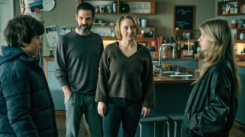 Reza (Yousef Sweid) und Blum (Anna Maria Mühe) unterhalten sich mit Tim (Lilian Rosskopf) und Nela (Emilia Pieske) über den anstehenden Friedhofsbesuch.