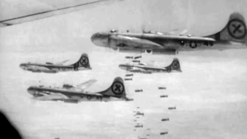Vier Militärflugzeuge fliegen in Formation, jedes mit einem „X“-Symbol am Heck gekennzeichnet. Bomben fallen aus den Flugzeugen und zeigen einen Moment der Luftkriegsführung, vermutlich aus einem historischen Konflikt.