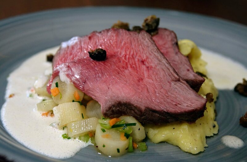 • Der Hauptgang von Benedikt Schultheis: rosa Kalbstafelspitz mit Schwarzwurzelsalat und Apfel- Meerettichschaum.