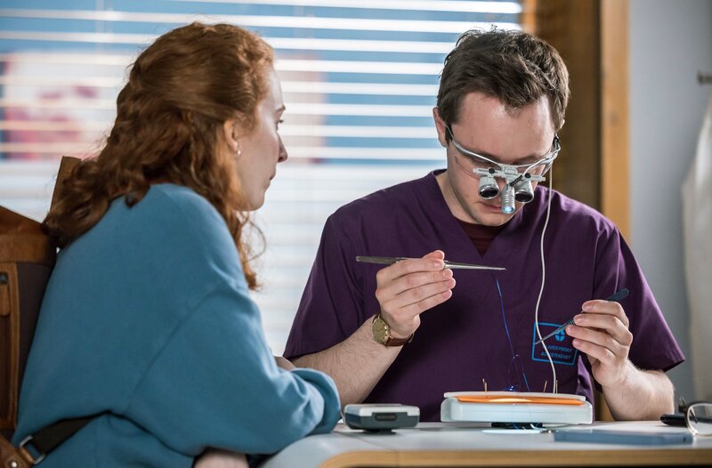 Tamar Hummel (Linda Kummer, l.) trifft Olli (Arne Kertész, r.) im Bereitschaftsraum, der in die Übung von Gefäßnähten vertieft ist und dabei seinen Dienstbeginn aus den Augen verliert.
