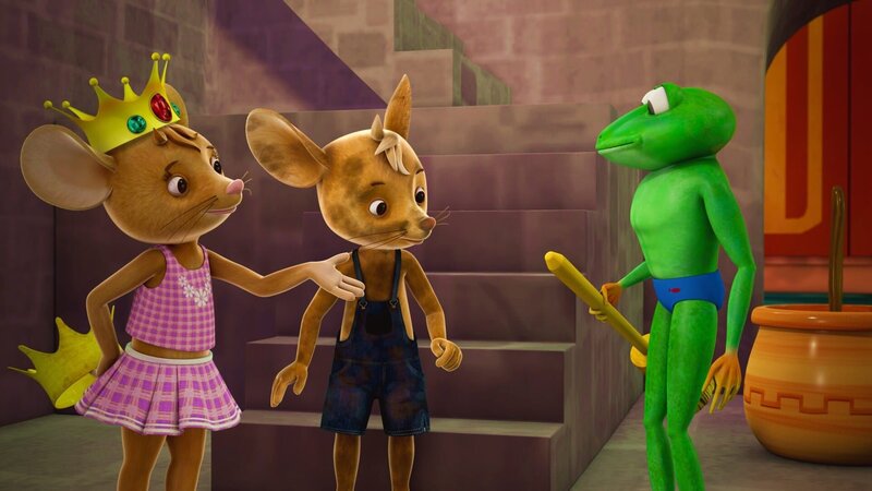 • Prinzessin Naya stellt ihrem Prinz Dreckspatz die erste Aufgabe. Er soll mit Carusos Zauberbesen den Hof blitzblank fegen.