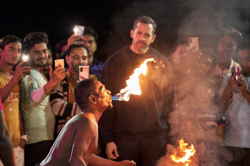 • Feuer-Ramesh demonstriert David Blaine das Spucken eines Feuerballs.