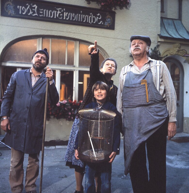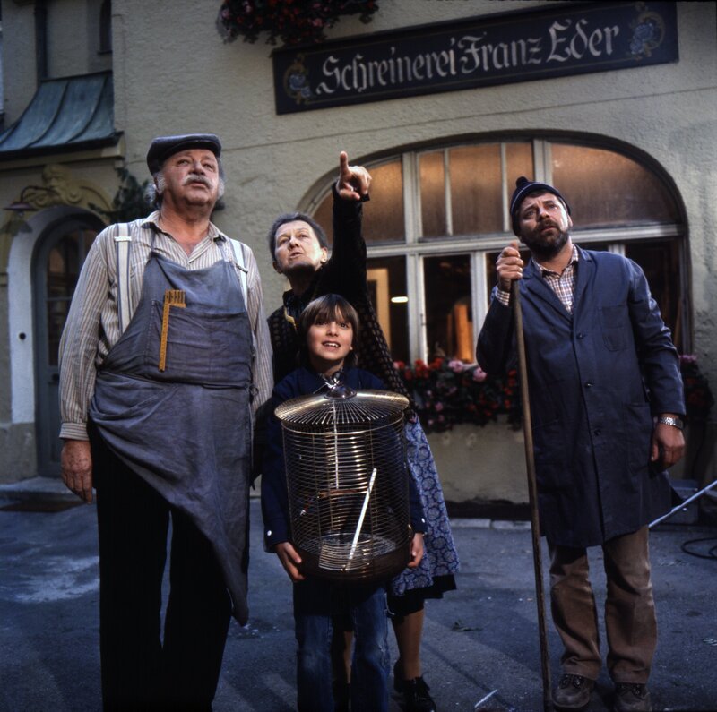 • Von links: Meister Eder (Gustl Bayrhammer), eine Nachbarin (Ingeborg Sassen-Haase), ein Kind (Tobias Herrmann) und der Hausmeister Stürzlinger (Werner Zeussel).