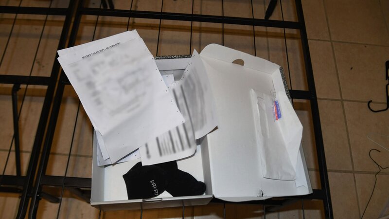 Das Bild zeigt einen offenen Karton, der auf einem Metallgestell steht, vermutlich Teil eines Bettes oder Regals. Im Karton befinden sich verschiedene Papiere, darunter Dokumente und Quittungen, sowie ein Paar schwarze Socken mit der Aufschrift „DRI-FIT“. Neben dem Karton liegt ein weißer Umschlag. Der Boden besteht aus Fliesen, was auf einen Innenraum hinweist, möglicherweise ein Zimmer oder einen Bereich zur Beweisuntersuchung.