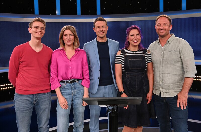 Moderator Alexander Bommes (M.) mit den Kandidaten: Radio-Eins-Moderatorin Amelie Ernst (l.), Kevin Holtmann (3.v.r.), BR3-Moderator Dominik Pöll (2.v.r.) und Marco Bock (r.).Bild: © ARD/Uwe Ernst
