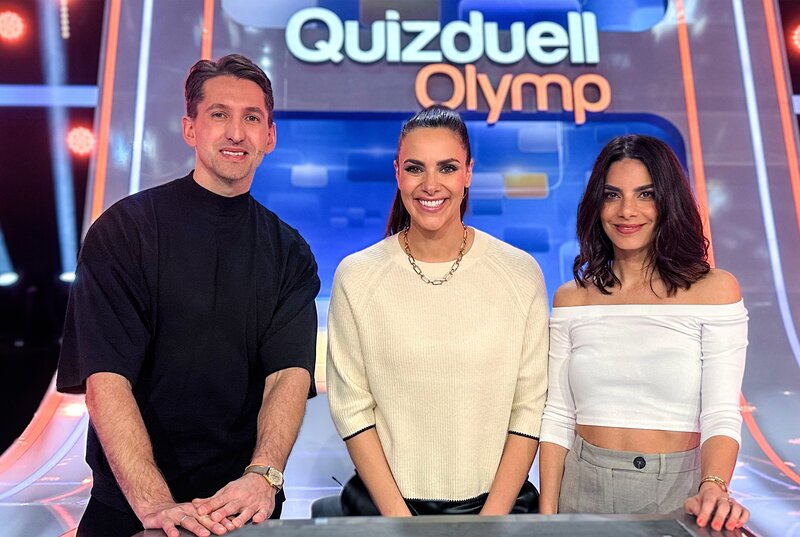 Moderatorin Esther Sedlaczek (M.) mit den Kandidaten des Teams "Liebe": René Adler (l.) und Lilli Hollunder (r.).Bild: © ARD/ITV Studios