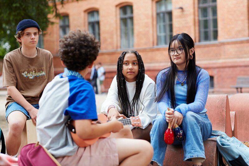 Milli (Marie Ngando Schröter) ist überrascht, dass die Band auf dem Schulhof übt. Sie bietet an, dass sie bei ihr Zuhause proben können.