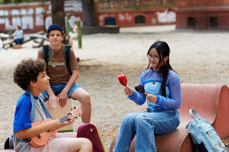 Châu (Ngoc Nhi Ha Tran, rechts), Tom (Noah Bailey, links) und Rod (Laszlo Chiesura, Mitte) üben ihren Song zusammen auf dem Schulhof, da der Proberaum besetzt war.