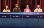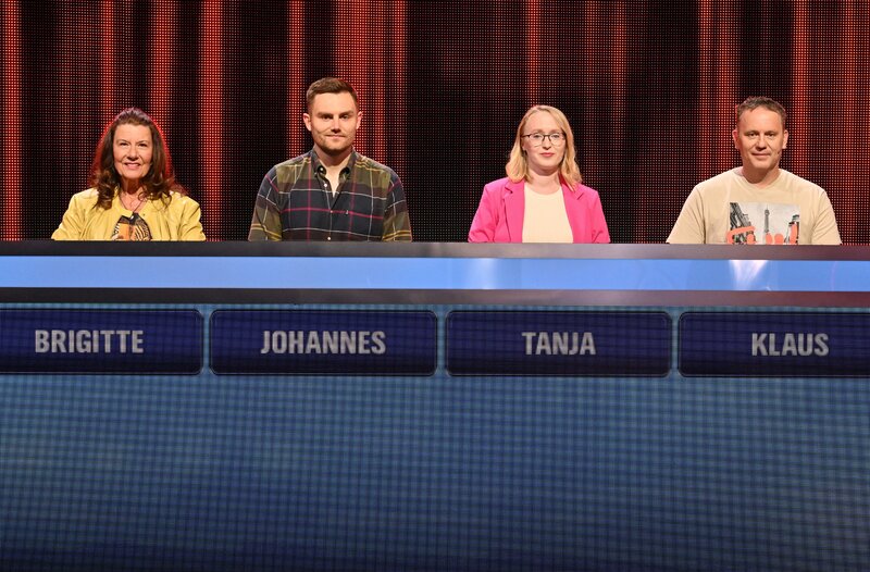 Moderator Alexander Bommes (M.) mit den Kandidat:innjen: Klaus Großlercher (l.), Brigitte Förster (3.v.r.), Johannes Goronzy (2.v.r.) und Tanja Markert (r.).Bild: © ARD/Markus Hertrich