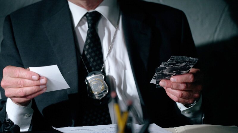 Eine Person in formeller Kleidung sitzt an einem Schreibtisch und hält eine Schwarz-Weiß-Fotografie. Auf dem Schreibtisch befinden sich Büroartikel wie Stifte und eine Lampe, was auf eine professionelle oder ermittelnde Umgebung hinweist.