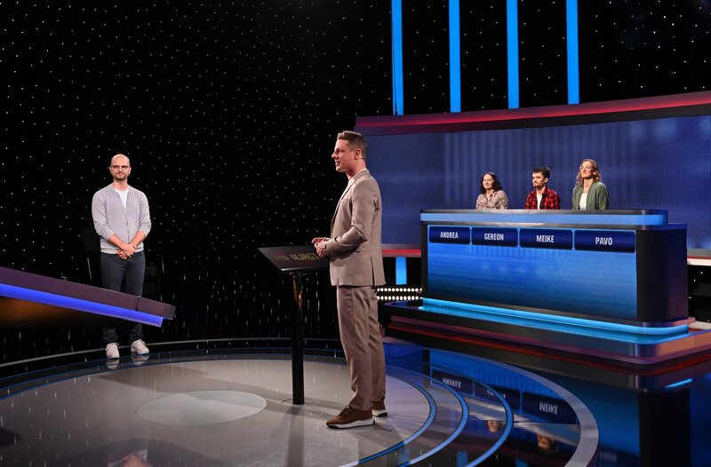 Moderator Alexander Bommes (M.) mit den Kandidat:innen: Pavo Terzic (l.), Andrea Becker (3.v.r.), Gereon Brakhan (2.v.r.) und Meike Fügner (r.).Bild: © ARD/Uwe Ernst